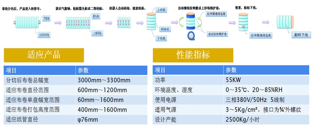 無紡布自動包裝線集軟件系統(tǒng)、周轉(zhuǎn)搬運(yùn)、生產(chǎn)線合流、機(jī)器人自動碼垛、自動放紙板、自動纏膜打包、自動覆頂模、自動尼龍袋纏繞包裝、自動稱重、自動打印標(biāo)貼、自動翻轉(zhuǎn)下線、自動入庫、立體倉庫等流程。